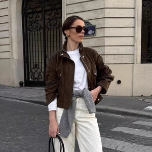 ZA速卖通爆款跨境外贸欧美风女装时尚宽松拉链饰立领绒面夹克外套