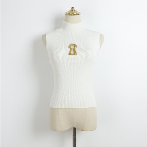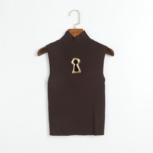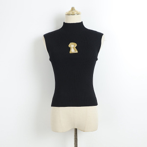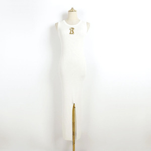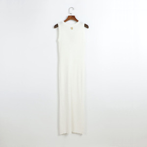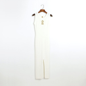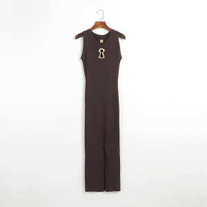 夏秋新款简约无袖针织连衣裙圆领金色锁孔图案开叉裙修身背心裙