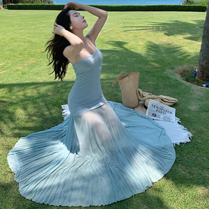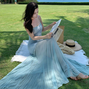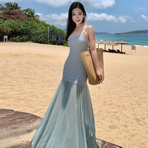 2025新款无袖修身显瘦气质斜肩串珠拼接网纱气质超仙吊带连衣裙