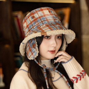 冬季帽子女日系复古加厚渔夫帽格子防风保暖护耳帽休闲百搭毛绒帽