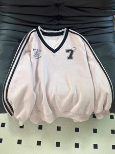 美式字母印花V领长袖卫衣女装早秋灰色独特蕾丝拼接宽松休闲上衣
