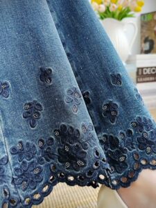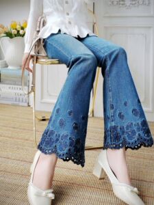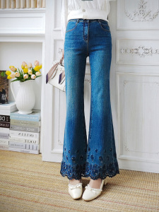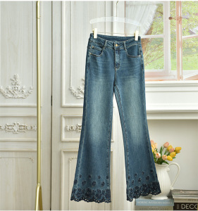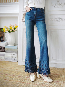 爆款跑量价复古镂空绣花烫钻牛仔裤女春秋中高腰微喇长裤修腿显瘦