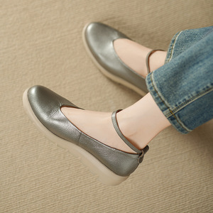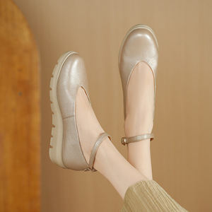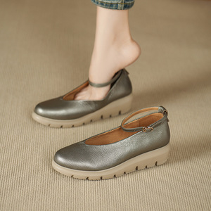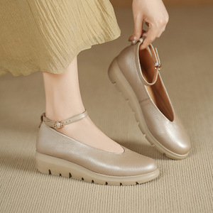 法式浅口单鞋女2025春秋厚底圆头中跟真皮百搭坡跟软底玛丽珍鞋女