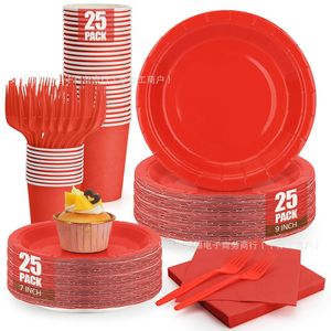 跨境热销一次性派对纸盘子酒红色圆盘生日婚礼一次性派对餐具套装