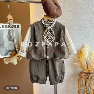 男童2025秋季新款韩版深棕色细条纹大口袋马甲套装时尚潮流三件套