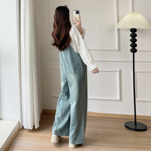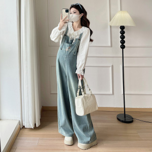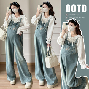 现货 2025秋季新款孕妇减龄套装刺绣牛仔背带裤套装微阔腿裤