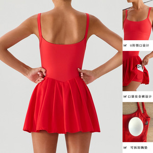 无袖运动瑜伽连衣裙健身假两件打底防走光口袋褶皱裙跑步网球裙女