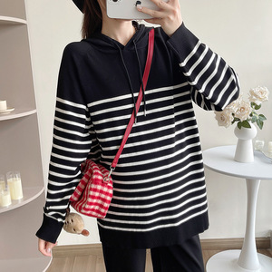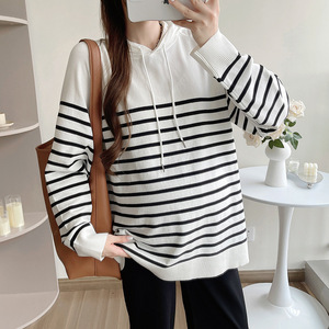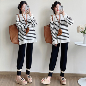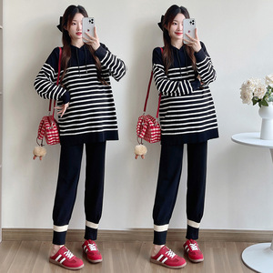 孕妇秋季套装2025新款条纹连帽上衣孕妇针织衫+束脚裤两件套