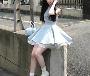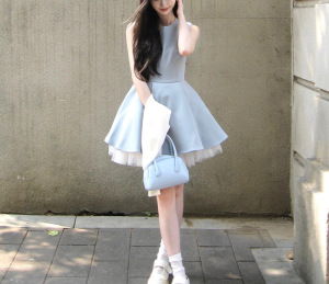 法式气质蓝色无袖背心连衣裙子女夏季2025新款蕾丝边收腰蓬蓬短裙