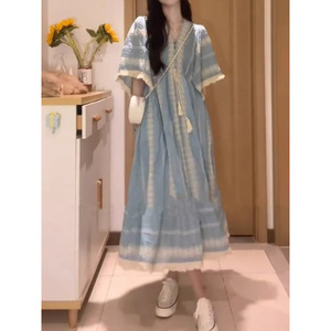 胖mm大码法式民族风连衣裙女装夏季宽松显瘦度假海滩长款短袖长裙