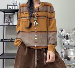 条纹撞色针织衫女 秋款 文艺复古宽松显瘦慵懒撞色休闲开衫毛衣
