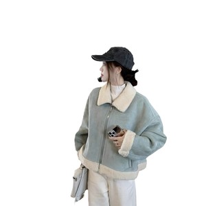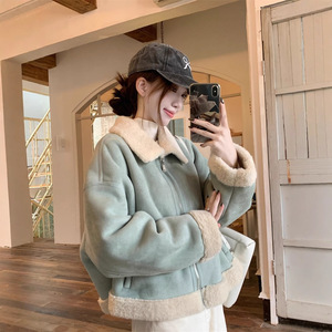 韩系高级感浅蓝色翻领短款羊羔毛外套女2025冬款皮毛一体夹克上衣