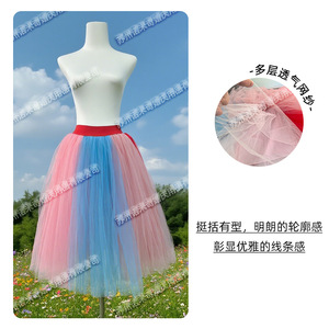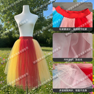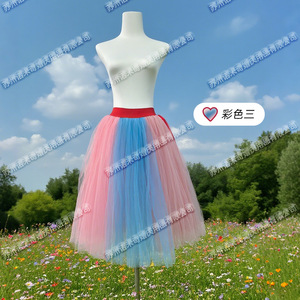 欧美中长款彩色拼接网纱半身衬裙撞色松紧高腰表演舞会蓬蓬纱裙女