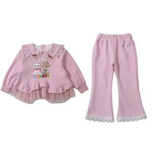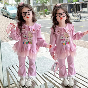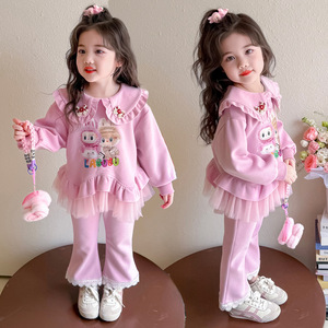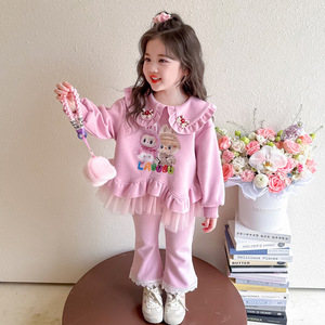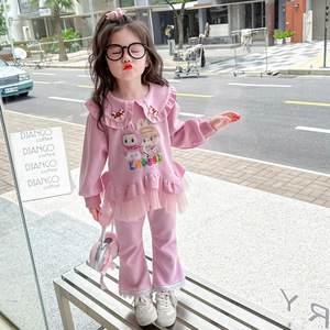 女童春秋套装2025新款女宝宝时髦娃娃领卫衣休闲卡通花边两件套潮