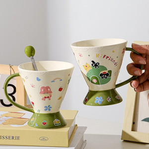 卡通浮雕动物绿色马克杯带勺特别好看的杯子办公室喝水杯女陶瓷杯