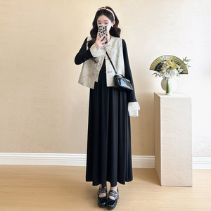孕妇装2025秋季新款韩版时尚网红气质显瘦新中式马甲蕾丝裙子套装
