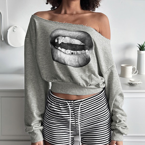 欧美街头风个性嘴唇印花灰色卫衣女舒适宽松短款露脐长袖上衣批发