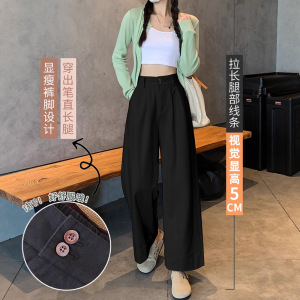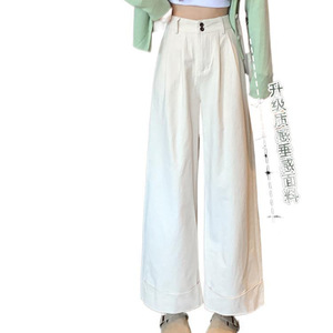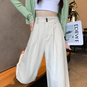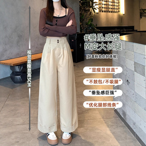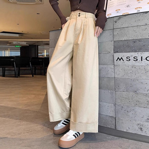 卡其色洗水棉工装阔腿裤女春秋小个子休闲宽松垂感卷边九分直筒裤