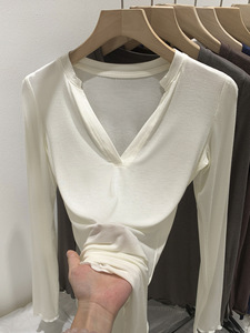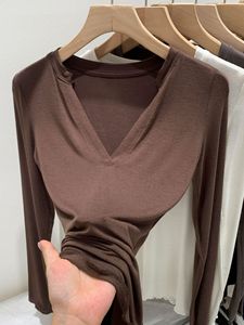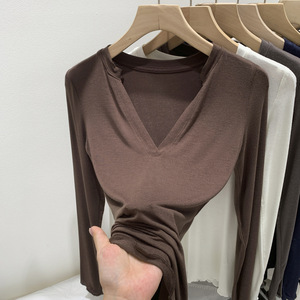 气质修身V领咖色纯欲内搭打底针织衫女秋季2025新款长袖T恤上衣潮
