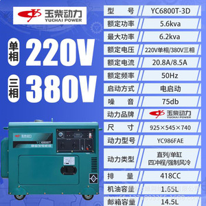 玉柴5/6KW柴油发电机220V/380V可选 开架 静音家用 电启动 发电机