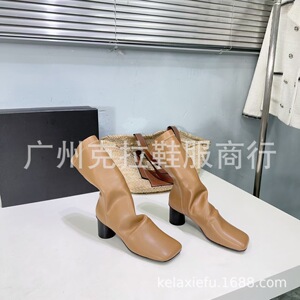 小众2025秋冬真皮方头复古褶皱粗跟高跟弹力靴瘦瘦靴时装靴裸靴女