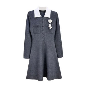 秋冬2025高级感撞色翻领学院风减龄浅灰色小个子针织修身连衣裙