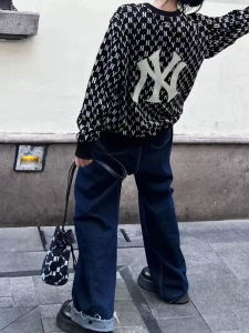 韩国MLB男女情侣复古满印老花运动圆领卫衣宽松休闲百搭套头外套