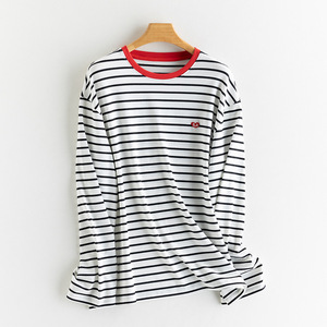 25秋季新款女装撞色条纹长袖T恤重工爱心刺绣宽松颜心精梳棉上衣