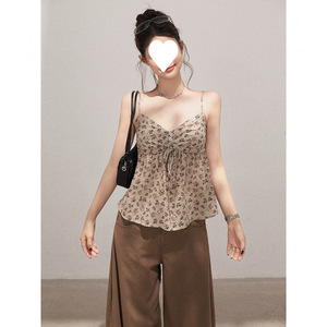 谢不肉 复古碎花V领无袖吊带背心女夏季设计感修身百搭短款上衣