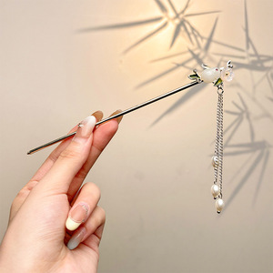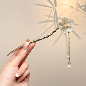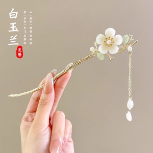 96#白玉兰花双花流苏发簪-金色 (袋装)