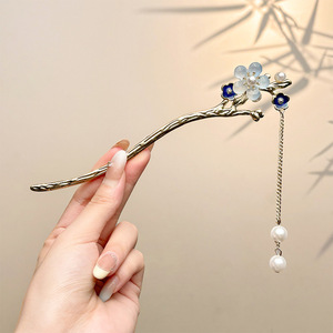 69#白粉双花珍珠流苏发簪-金色 (袋装)