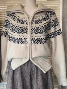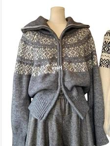 韩版杏色双拉链羊毛针织开衫女秋冬季加厚费尔岛提花高领毛衣外套