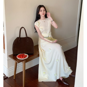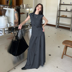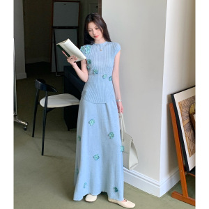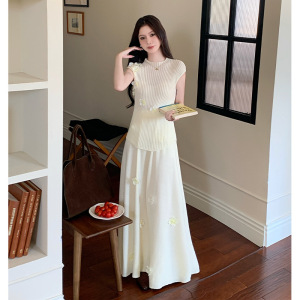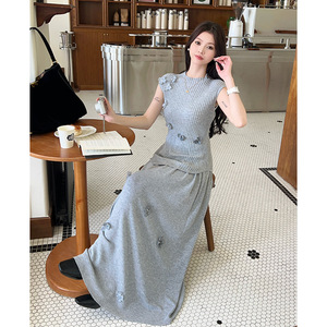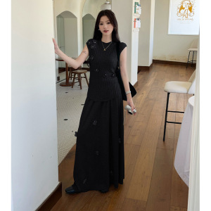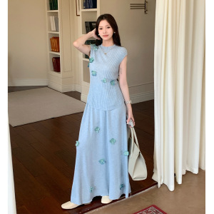 高品质新款设计感法式立体绣花针织背心上衣长款半身裙两件套装女