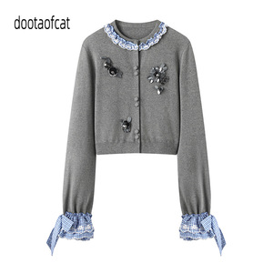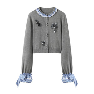 2025秋季新款时尚格子拼接钉珠重工刺绣针织开衫上衣FF25Q31ZM093