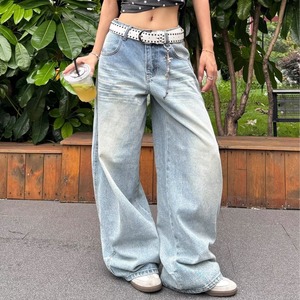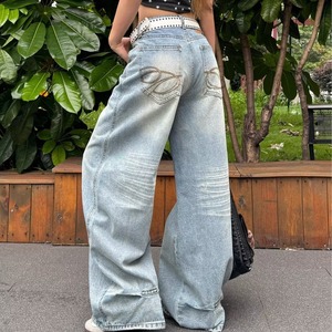 美式复古口袋刺绣牛仔裤男女同款宽松高腰显瘦休闲阔腿裤拖地长裤
