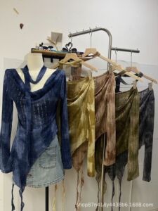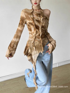 美式复古扎染一字肩喇叭长袖针织打底衫女春秋季外穿内搭修身上衣