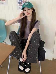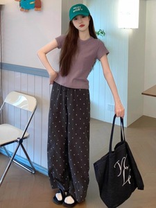 韩系休闲运动套装女新款紫色纯欲正肩短袖上衣垂感长裤两件套夏季