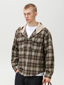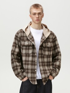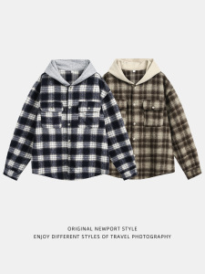 美式复古磨毛格子长袖衬衫男秋季款撞色拼接格纹连帽衬衣潮牌外套