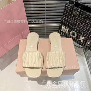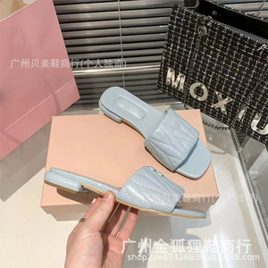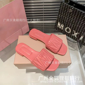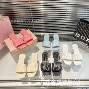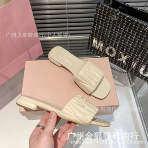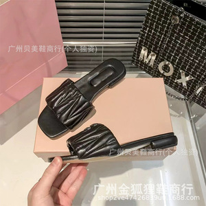 缪缪褶皱平底拖鞋女2025夏季新款外穿方头平跟一字拖度假沙滩凉拖