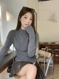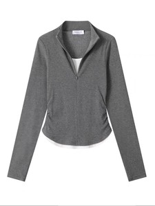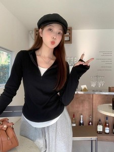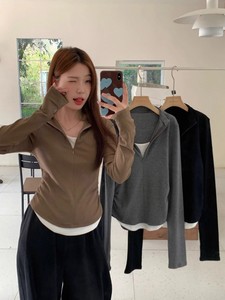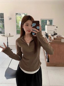 2025新款秋美式复古小众假两件立领长袖T恤修身显瘦内搭打底衫女