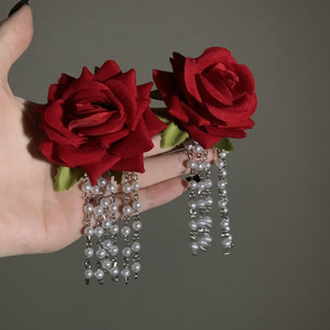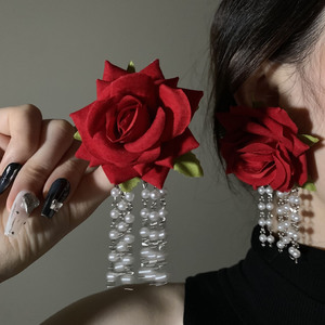 银针布艺花朵珍珠流苏耳环时尚超仙气质耳钉小众高级感百搭耳饰女