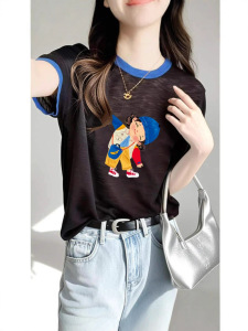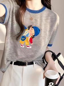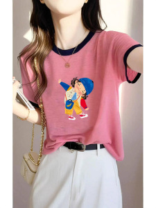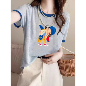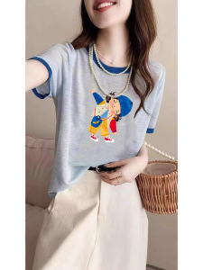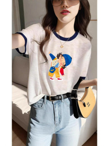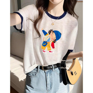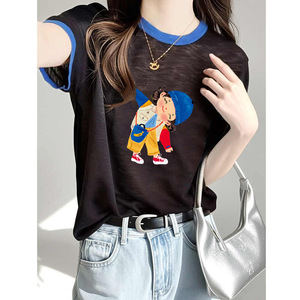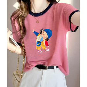 撞色薄款透气圆领t恤女款2025夏季新款韩版卡通印花短袖上衣ins潮