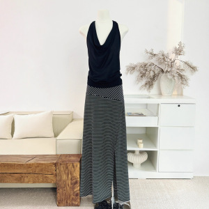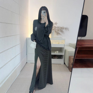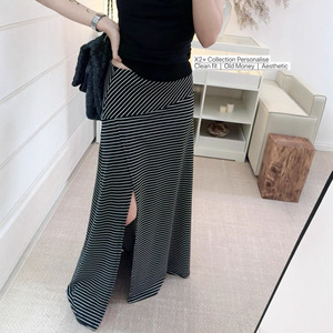 黑色条纹针织半身裙女设计感小众高腰开叉半裙
