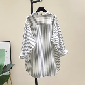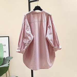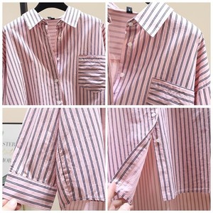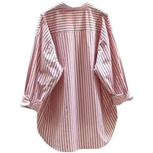 现货中长款单口袋竖条纹衬衫女春秋季新款BF简约宽松长袖开衫衬衣