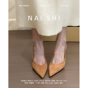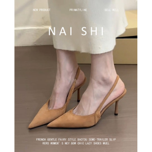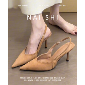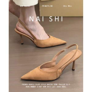 羊皮版!复古绒面包头凉鞋女高级感细跟尖头单鞋浅口后空高跟鞋