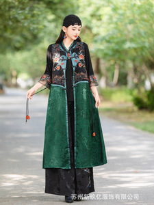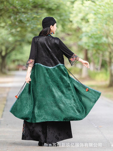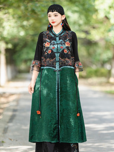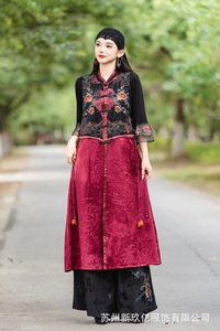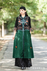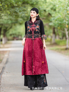 2025秋季款立领盘扣民族风刺绣缎面提花中长款连衣裙女无袖背心裙