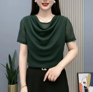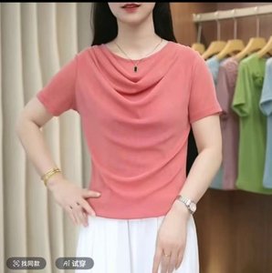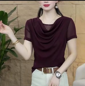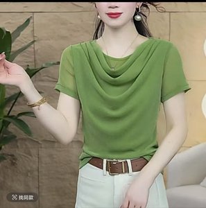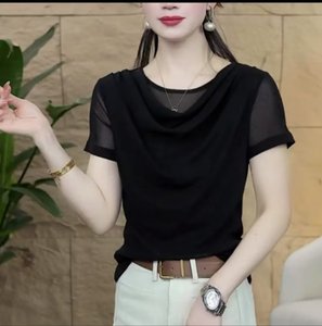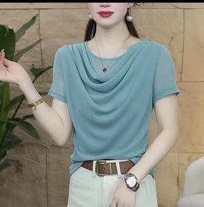 一件代发直播爆款2025夏季新款时尚百搭纯色堆堆领网纱弹力短袖T