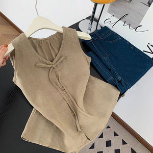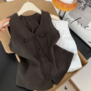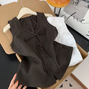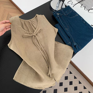 法式复古时尚松弛感绑带无袖背心女夏季简约百搭休闲V领宽松上衣