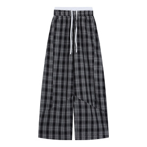 美式潮牌拼接假两件双腰头格子裤男女复古慵懒风宽松阔腿休闲裤子