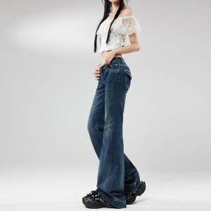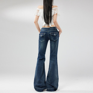 【易梦玲同款】复古水洗蓝超低腰高弹力微喇牛仔裤长裤加长
